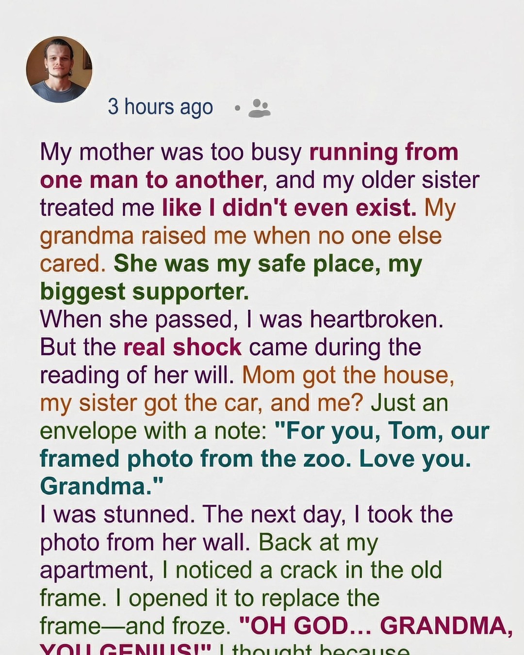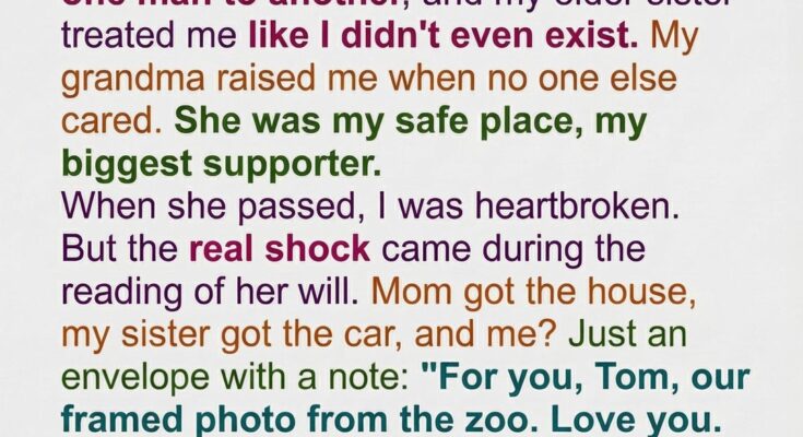 When my grandmother, Grace, passed away, I expected her will to reflect the quiet but deep relationship we had built. She raised me from the time I was six, stepping in when my mother and sister were too consumed with their own lives to notice the little boy slipping through the cracks. With her, I learned what it meant to be cared for: handwritten lunch notes, cheering from the front row at every school event, and soft encouragement even on the days I didn’t believe in myself. So when we gathered after her funeral to hear the will, I believed her presence would linger in whatever she left behind. Instead, my mother inherited the house, my sister received the car, and I was given only a single framed photo of the two of us at the zoo—one I had seen on her hallway wall for years.