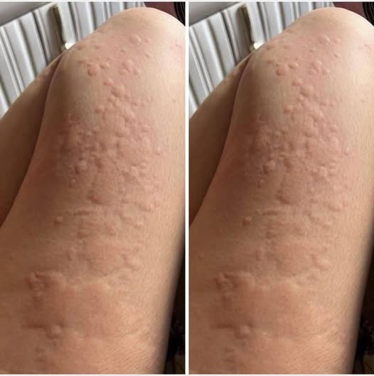 Folliculitis is an infection of the hair follicles, often caused by bacteria such as Staphylococcus aureus. This can lead to clusters of red or white-headed pimples around hair follicles, as seen in the photo. Folliculitis can be itchy, painful, and may result in scarring or spreading if not treated properly.
